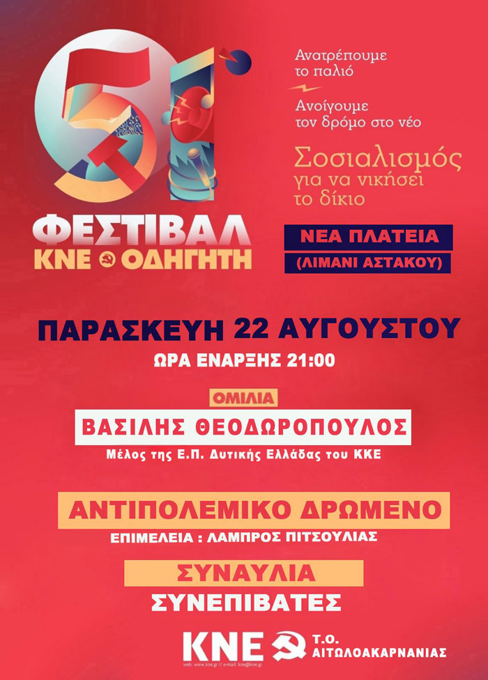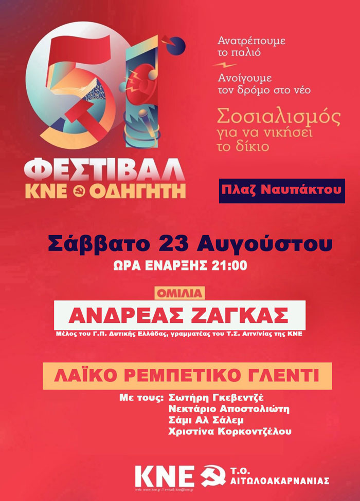 Με σύνθημα «Ανατρέπουμε το παλιό, ανοίγουμε τον δρόμο στο νέο. Σοσιαλισμός για να νικήσει το δίκιο!», το 51ο Φεστιβάλ ΚΝΕ-Οδηγητή έχει ξεκινήσει το ταξίδι του σε όλη τη χώρα, δίνοντας ξανά το παρών σε δεκάδες πόλεις.